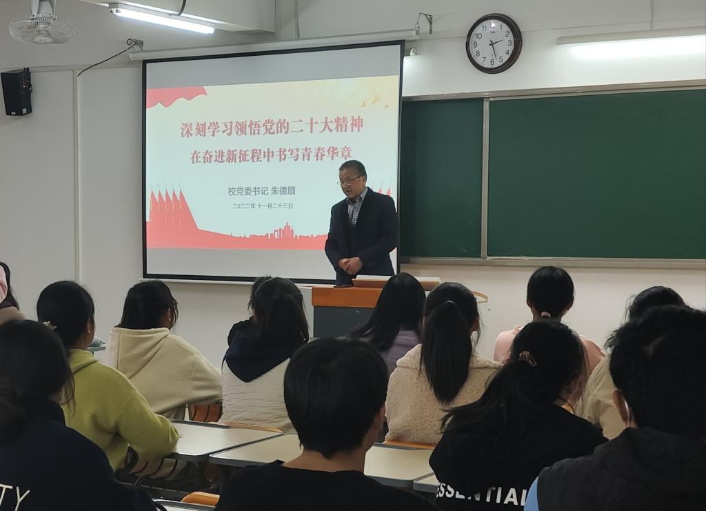 2022年11月23日下午在球盟会qmh第二教学楼322教室,校党委书记朱德顺为大一新生上了一堂精彩、激昂的“形势与政策”课,以“在奋进新征程中书写青春华章”为题,宣讲党的二十大精神。qmh球盟会亚博网址院长助理陈志操主持,2022级经济学普本新生代表参加。