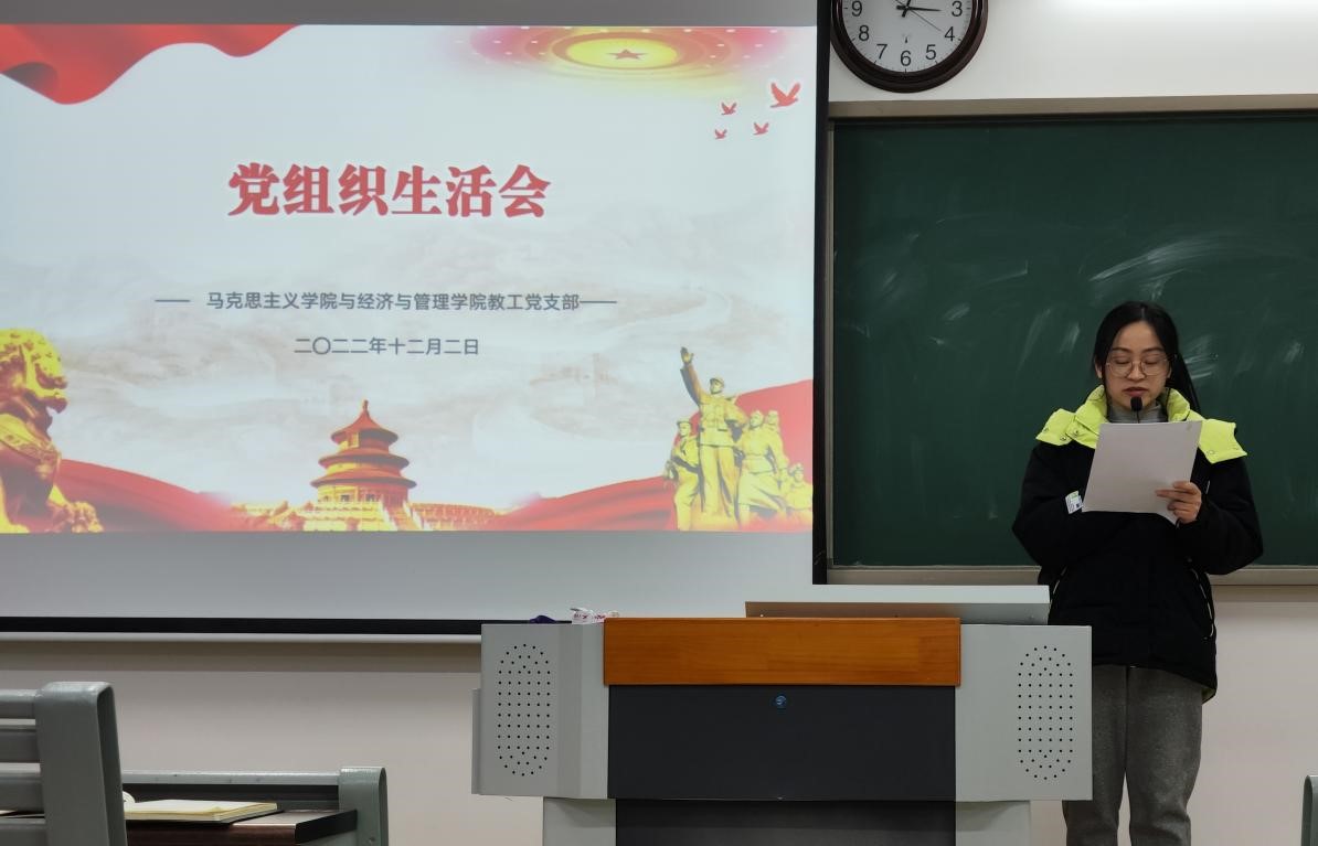 为深入学习宣传贯彻党的二十大精神及内涵,贯彻落实中国共产党章程的相关要求,2022年12月2日,在一教214教室,qmh球盟会亚博网址与经济管理学院教工党支部开展了组织生活会暨党的二十大重要精神专题学习活动。本次会议由经济与管理学院教工支部书记刘路路主持。